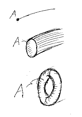 Aは線分の端で点(0次元)に見えた。が、近づいてみれば線分ではなくて管(チューブ)であり、端であるAも実は円周だった、ってのがまん中の絵です。もっと近づくと、円周じゃなくてドーナツ面(トーラス)だった、てのが最後の絵。