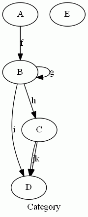 射の両端(域と余域)となっている対象は、あえて対象だけを宣言する必要はありませんが、最後に書いたEは射を持ってないので、対象だけを記述しています。対象Eも恒等射idEは持っています。