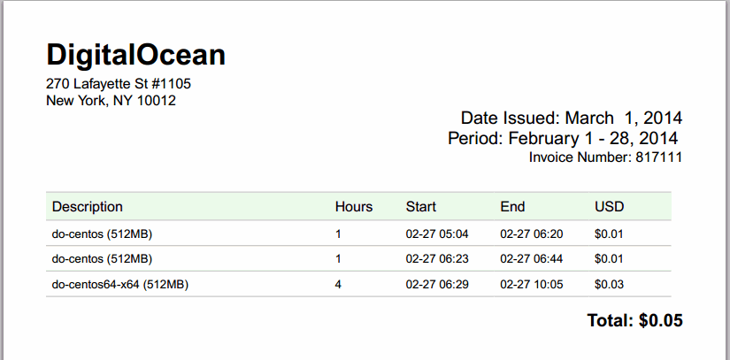 SSDなVPSを提供するDigitalOcean(https://www.digitalocean.com/)については、徳丸さんの記事に分かりやすく紹介されています。徳丸さん記事のタイトル「1時間1円から使える」から、「1円クラウド・ホスティング」と名づけてみたのですが、これはウソではありません。現状の僕の利用明細は次のとおりです。