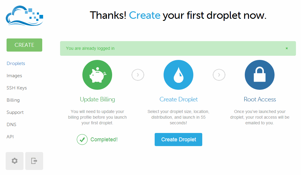 Your new droplet has been created! You can access it using the following credentials: IP Address: xxx.xxx.xxx.xx Username: root Password: yyyyyyyyyyyy