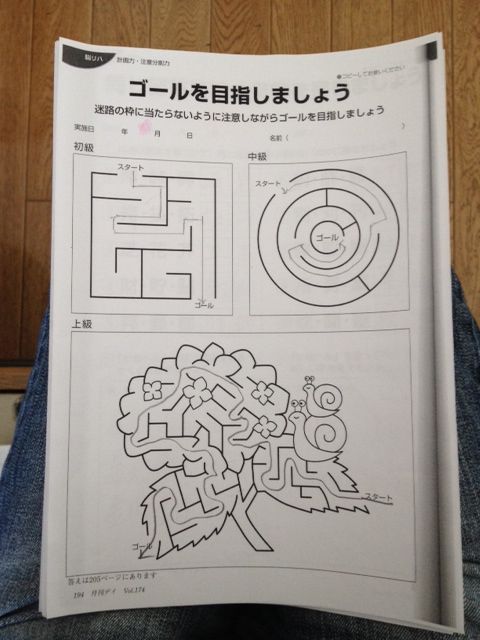 これは迷路の問題。三番目はけっこう難しいと思う。消して書き直した跡がないので、目視か指でなぞるかして正解を得てから記入したのだろう。