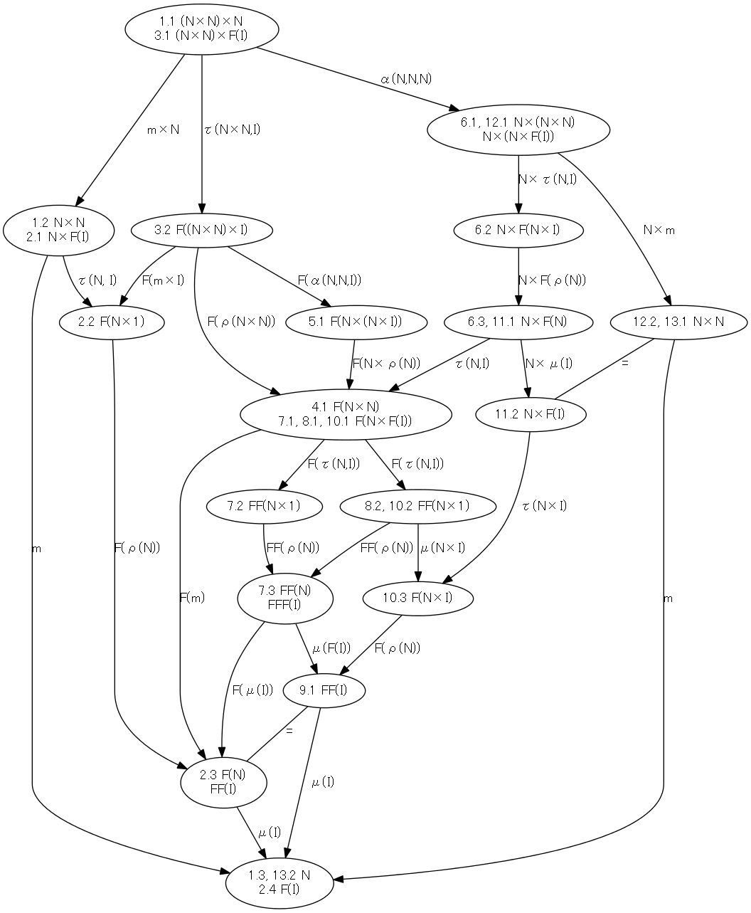 // -*- coding: utf-8 -*- // This is m2m-assoc.gv digraph Assoc { /* 1 */ trm1_1 [label="1.1 (N×N)×N\n3.1 (N×N)×F(I)"]; trm1_2 [label="1.2 N×N\n2.1 N×F(I)"]; trm1_3 [label="1.3, 13.2 N\n2.4 F(I)"]; trm1_1 -> trm1_2 [label="m×N"]; trm1_2 -> trm1_3 [label="m"]; /* 2 */ trm1_2 -> trm2_2 [label="τ(N, I)"]; // trm2_1 = trm1_2 trm2_2 [label="2.2 F(N×1)"]; trm2_3 [label="2.3 F(N)\nFF(I)"]; trm2_2 -> trm2_3 [label="F(ρ(N))"]; trm2_3 -> trm1_3 [label="μ(I)"]; /* 3 */ trm1_1 -> trm3_2 [label="τ(N×N,I)"]; // trm3_1 = trm1_1 trm3_2 [label="3.2 F((N×N)×I)"]; trm3_2 -> trm2_2 [label="F(m×I)"]; /* 4 */ trm3_2 -> trm4_1 [label="F(ρ(N×N))"]; trm4_1 [label="4.1 F(N×N)\n7.1, 8.1, 10.1 F(N×F(I))"]; trm4_1 -> trm2_3 [label="F(m)"]; /* 5 */ trm3_2 -> trm5_1 [label="F(α(N,N,I))"]; trm5_1 [label="5.1 F(N×(N×I))"]; trm5_1 -> trm4_1 [label="F(N×ρ(N))"]; /* 6 */ trm1_1 -> trm6_1 [label="α(N,N,N)"]; trm6_1 [label="6.1, 12.1 N×(N×N)\nN×(N×F(I))"]; trm6_2 [label="6.2 N×F(N×I)"]; trm6_3 [label="6.3, 11.1 N×F(N)"]; trm6_1 -> trm6_2 [label="N×τ(N,I)"]; trm6_2 -> trm6_3 [label="N×F(ρ(N))"]; trm6_3 -> trm4_1 [label="τ(N,I)"]; /* 7 */ trm4_1 -> trm7_2 [label="F(τ(N,I))"]; // trm7_1 = trm4_1 trm7_2 [label="7.2 FF(N×1)"]; trm7_3 [label="7.3 FF(N)\nFFF(I)"]; trm7_2 -> trm7_3 [label="FF(ρ(N))"]; trm7_3 -> trm2_3 [label="F(μ(I))"]; /* 8 */ // trm8_1 = trm4_1 trm4_1 -> trm8_2 [label="F(τ(N,I))"]; trm8_2 [label="8.2, 10.2 FF(N×1)"]; trm8_2 -> trm7_3 [label="FF(ρ(N))"]; /* 9 */ trm7_3 -> trm9_1 [label="μ(F(I))"]; trm9_1 [label="9.1 FF(I)"]; trm9_1 -> trm1_3 [label="μ(I)"]; trm9_1 -> trm2_3 [label="=", arrowhead="none"]; /* 10 */ // trm10_1 = trm4_1 // trm10_2 = trm8_2 trm10_3 [label="10.3 F(N×I)"]; trm8_2 -> trm10_3 [label="μ(N×I)"]; trm10_3 -> trm9_1 [label="F(ρ(N))"]; /* 11 */ trm6_3 -> trm11_2 [label="N×μ(I)"]; // trm11_1 = trm6_3 trm11_2 [label="11.2 N×F(I)"]; // trm11_3 = trm10_3 trm11_2 -> trm10_3 [label="τ(N×I)"]; /* 12 */ trm6_1 -> trm12_2 [label="N×m"]; // trm12_1 = trm6_1 trm12_2 [label="12.2, 13.1 N×N"]; trm12_2 -> trm11_2 [label="=", arrowhead="none"]; /* 13 */ // trm13_1 = trm12_2 // trm13_2 = trm1_3 trm12_2 -> trm1_3 [label="m"]; }