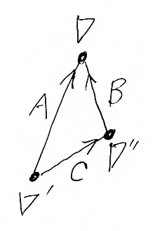 もう一度上の絵を見てください; ∇'はフレームの標準共変微分です。∇'から∇を見たときの接続係数(差分)がAです。∇''は別な(第二の)フレームの標準共変微分だとします。∇''から∇を見たときの接続係数(差分)がBですね。そして、2つのフレームの標準共変微分の差=接続係数がCです。次の関係は明らかでしょう。
