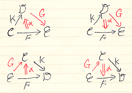 随伴の左右と結びつけることにします。随伴に関しては、左右の定義を覚えてます(僕は)。これもコジツケで覚えてるのですが、今日はそのコジツケの話はしないで、ともかくも「随伴の左右は知ってるよ」を前提します*1。