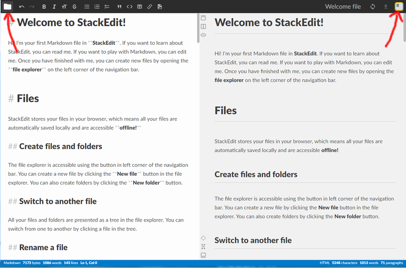 エディタの画面は、操作用UI部品を水平方向ツールバーと垂直方向ツールバー〈スプリッター〉に集約する今風のデザインです。注目すべきは、水平ツールバーの左端にあるフォルダーアイコンと右端にあるシャープマークアイコンです。