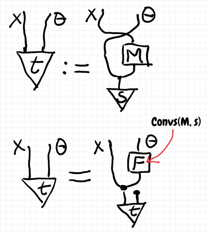 この等式は、ベイズ反転を公理的に定義するときの条件式になります。つまり、与えられたMとsに対して、この等式を満たすようなFが(あれば、それが) Convs(M, s) です。