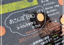 おさんぽ日和にいってきました* 2011年11月05日 こんばんは、なつめです。今日はSouts Kutte さんで行われていた 『おさんぽ日和 』に行ってきました。前回は出展させていただいたイベント。今回もお誘いいただいたのですが、先約があり(こちらの話は流れたのですが)自分のキャパと相談して(家族の様子とも相談して)今