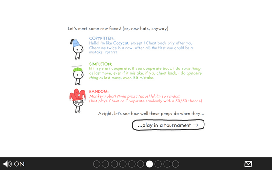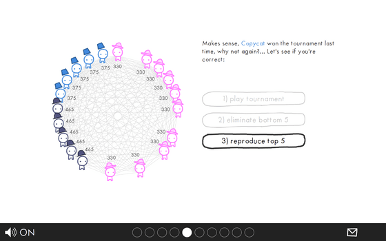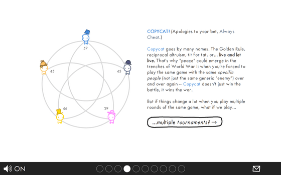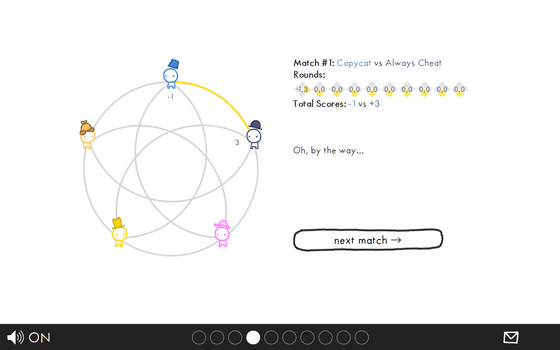 5つのNPCの素性が明らかになったところで、次はNPC同士が対戦するとどうなるかをシミュレートします。NPCは他のNPCと1人ずつ、10ラウンドプレイするので、最終的に誰が一番多くのコインを獲得するのかを推測してクリックします。常にズルをするNPCが強そうだったので今回は常にズルをするNPCを選んでみました。