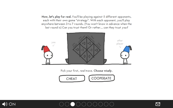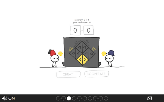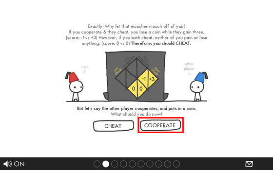 さて、ここで相手がズルをすることがわかっているとします。自分はズル(CHEAT)をすべきか、協力(COOPERATE)すべきかを選択しなければなりません。今回は損をしたくないので「CHEAT」をクリックしてみます。