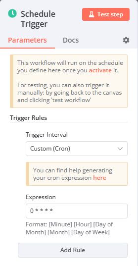 こちらは「Schedule Trigger」ノードをトリガーとします。「Trigger Interval」を「Custom (Cron)」に設定することで、将来的にスケジュールを柔軟に変更できるようにしておきます。