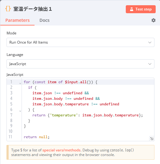 最後に、レスポンスデータを「Code」ノードで処理し、必要な室温データのみを取り出します。ここではライブラリは使用しないので、使用