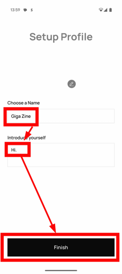 名前と自己紹介欄を埋めて、「Finish」をタップ。