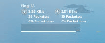 フォートナイト」を「ネットデバッグのステータス」を表示しながらプレイしてみました。かなり表示が小さくて見えづらいですが、Wi-Fi接続時のダウンロード速度は3.29KB/s、アップロード速度は2.81KB/s、Ping値は33でした。