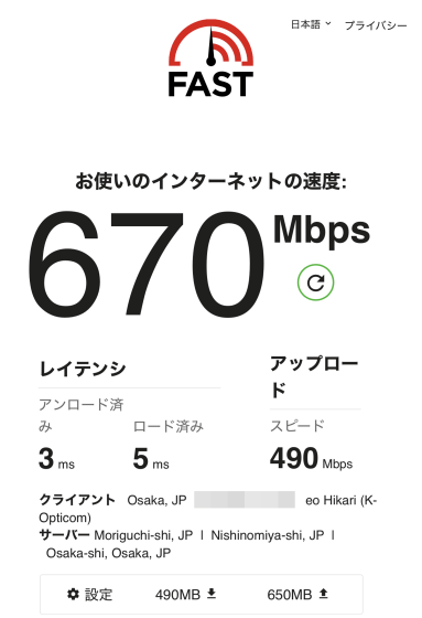 有線LAN接続時の通信速度はダウンロード速度が670Mbpsで、アップロード速度は490Mbps。レイテンシも短くなっています。