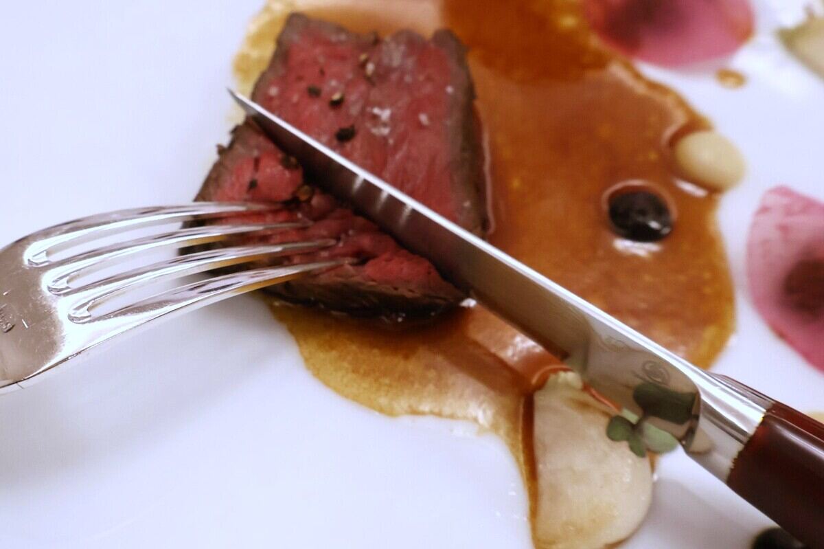 メインの「若狭牛もも肉のポワレ ペドロヒメネスヴィネガーを効かせた 20年熟成ポルトソース」は焼いた牛のもも肉に20年熟成のポルトルージュソースを添えています。牛肉の料理には赤ワインが良いとのことで、メインのみあわせるお酒は「Château des Annereaux Lalande-de-Pomerol 2006」が提供されました。牛肉のカットにと提供されたナイフは福井県越前市「高村刃物製作所」のものです。