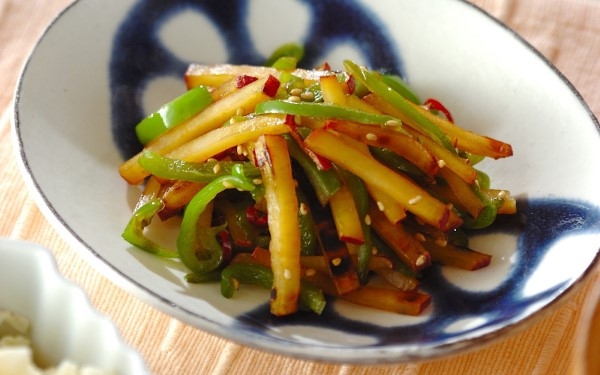 ピーマンのほろ苦さとサツマイモの甘さのバランスが最高です。シャキシャキ&ホクホクの歯ごたえも良く、ピリッと甘辛味でお箸が止まりません。食物繊維とビタミンCが摂れて、毎日の献立に重宝する一品です。