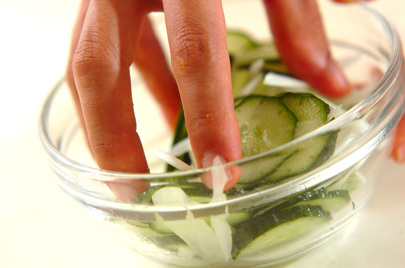 1、キュウリは薄い輪切りにし、玉ネギは縦に薄切りにする。分量外の塩少々で軽くもみ、しんなりしたら水洗いして水気を絞る。