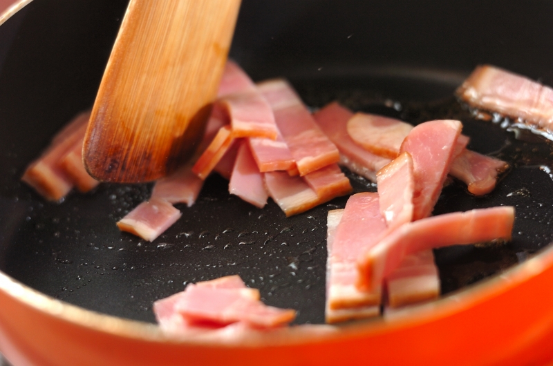 3、フライパンにゴマ油を中火で温めてベーコンを炒め、<