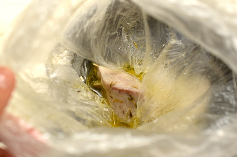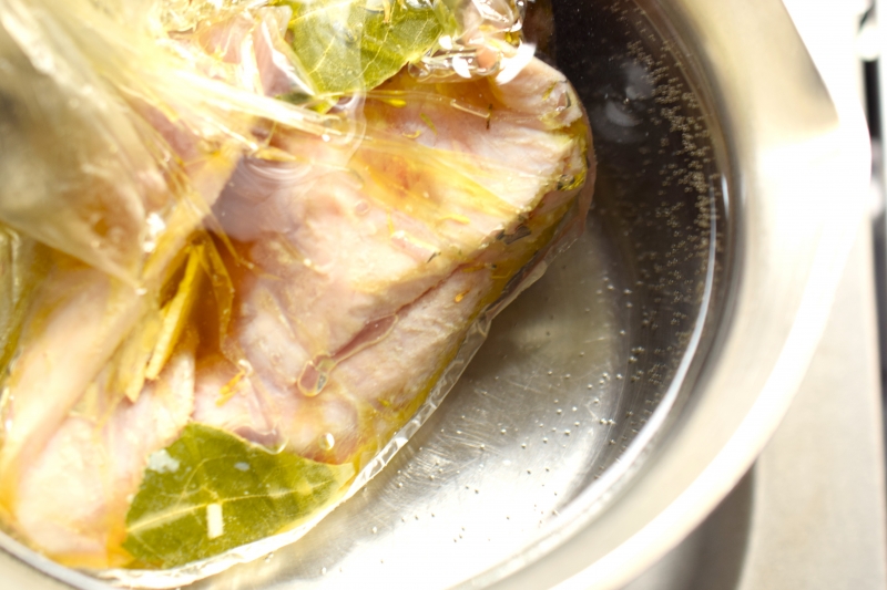 5、ビニールの結び目をほどき、マグロの中心まで火が通っているか確認する。火か通るまで加熱する。