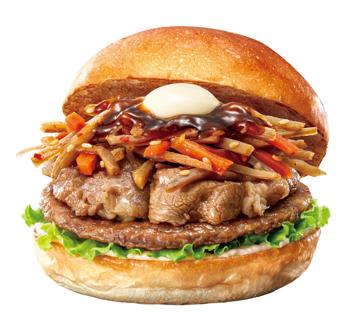 ハンバーグパティに甘辛く味付けした牛カルビを合わせ、きんぴら、レタス、特製てりやきソース、