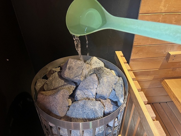 こちらもロウリュOK。ちょっと変わった形のラドル(柄杓)で、ゆっくりと水をかけていく。ロウリュは蒸気で体感温度を上げるだけでなく、この音も魅力。癒やされるというか、浄化されるような感覚が気持ちいい。“無”になれるという人もいるが、“無”にならずとも、なんとなく体の力が緩められるような感じがする。