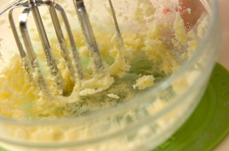1、ボウルに無塩バターを入れて滑らかになるまで練り、グラニュー糖を加えて白っぽくなるまでよくすり混ぜ、さらに溶き卵を少しずつ加えてその都度しっかりと混ぜる。