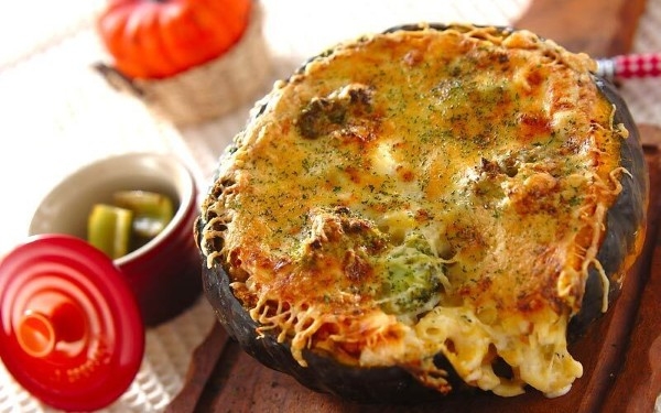 贅沢にカボチャを丸ごと使い、主役級の存在感。チーズをたっぷりのせるのがコツです。ホクホク甘いカボチャとホワイトソースがよく合います。マカロニやキノコなども入れるため、食べ応えも十分です。中の具材を取りつつ、外側の皮ごと一緒に崩しながら召し上がれ。