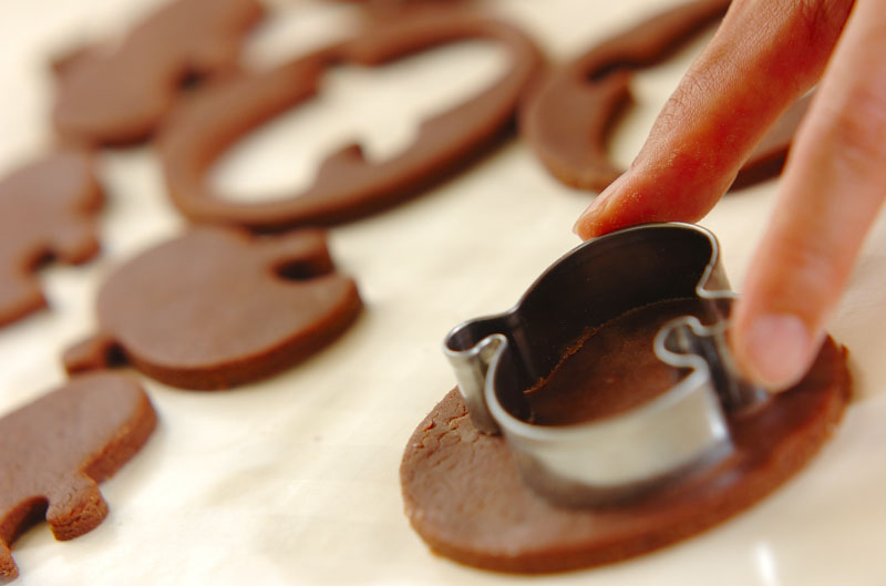 3、打ち粉を麺棒と生地の両面にして、厚さ3〜5mmに伸ばす。丸とおばけの形のクッキー型で抜く。170℃に予熱しておいたオーブンで12分焼く。