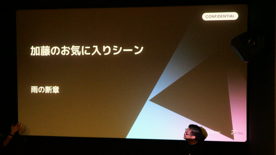 Adobe After Effectなどのソフトを使って行います。しかし、このシーンは部屋の3Dレイアウトデータを使い、3Dソフトを使って処理を行っているそうです。加藤さんによれば、この処理は「撮影」と呼ぶには微妙なラインで、まさに「ビジュアルエフェクト」に当たるとのこと。津田さんは「これはビジュアルエフェクトっていう仕事を表わしているカットなのでよくできたなと思っています」と語りました。