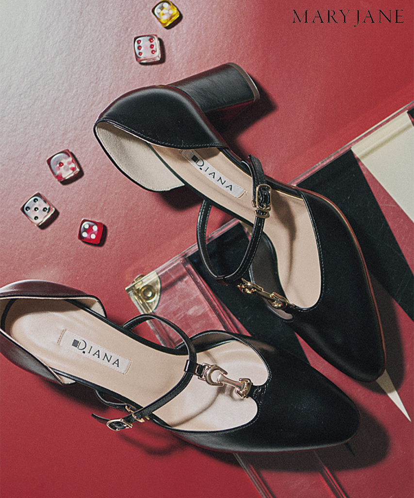 ブラックヒールシューズ(6)/ダイアナ(ダイアナ 銀座本店) ソックス、シアーなタイツ、素足など、レディな足元バリエーションを増やせる肌感多めの黒パンプス。メタルでつないだTストラップならさらに大人顔。