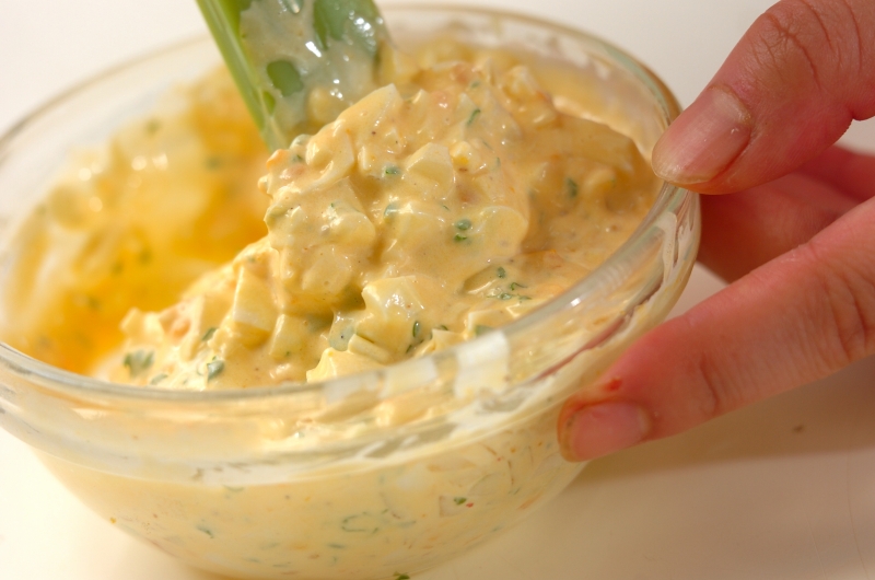 2、<タルタルソース>の玉ネギとゆで卵はみじん切りにし、他の材料と混ぜ合わせる。