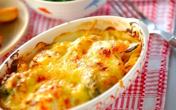 グラタン。クリーミーなソースとプリッとしたエビ、ブロッコリーの歯応えなどが三位一体となり、リッチな洋食を楽しめます。エビを牡蠣に、マッシュルームをシメジに変えたりと、旬の食材でアレンジするのもおすすめです。
