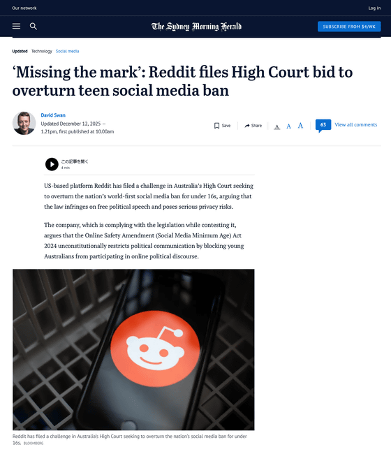 世界初となる「16歳未満のSNS利用を禁止する法律」が施行され、政府が禁止対象として指定したプラットフォームは、16歳未満のユーザーのアカウントを無効化することが求められるようになりました。その対象に含まれるソーシャル掲示板サイト・Redditが、「憲法で定められた政治的