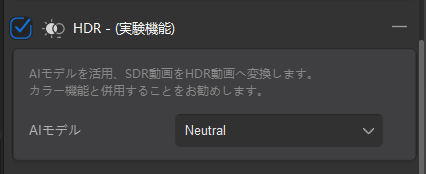 「HDR - (実験機能)」ではSDR動画をHDR動画に変換することができます。利用できるAI