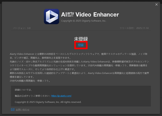 「ライセンス対象」にライセンス購入時に利用したメールアドレスを入力。GIGAZINE読者向けに配布されているライセンスコードを利用する場合は、任意のメールアドレスを入力すればOK。「ライセンスコード」にはライセンスコードをコピー&ペーストします。メールアドレスとライセンスコードが正しいことを確認したら、「登録」をクリック。これでAiarty Video Enhancerのフル機能が利用できます。