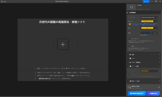 画面右上にある「ハードウェア」から、AI高画質化処理に使用するハードウェアを選択します。内蔵
