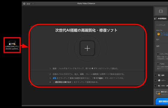 Aiarty Video Enhancerを使うには、まずはAIで高画質化したい動画をドラッグ&ドロップで赤枠部分に移動させます。