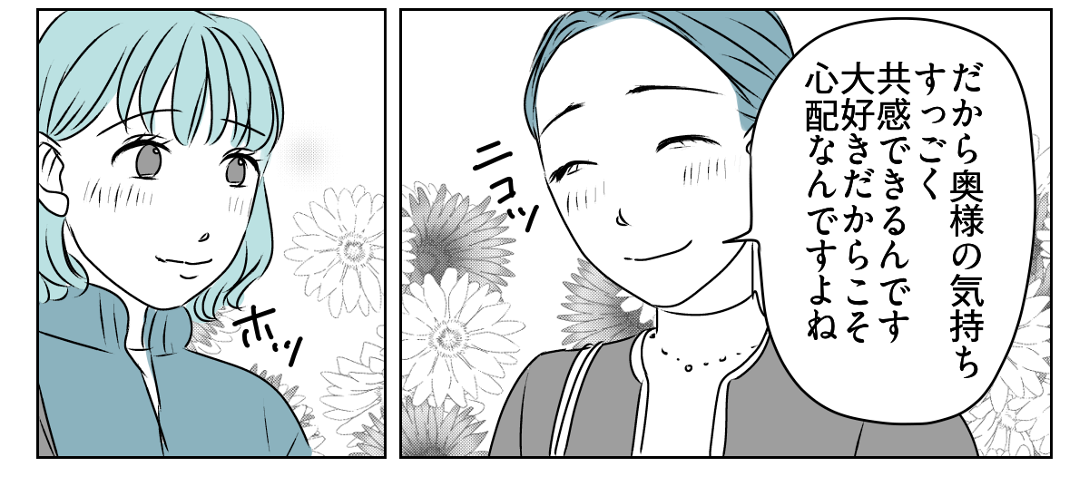 結婚したばかりなこと、そして奥様と同じような思いをしていることを話しました。そして奥様の表情がふっと柔らかくなったのを見て、安心しました。
