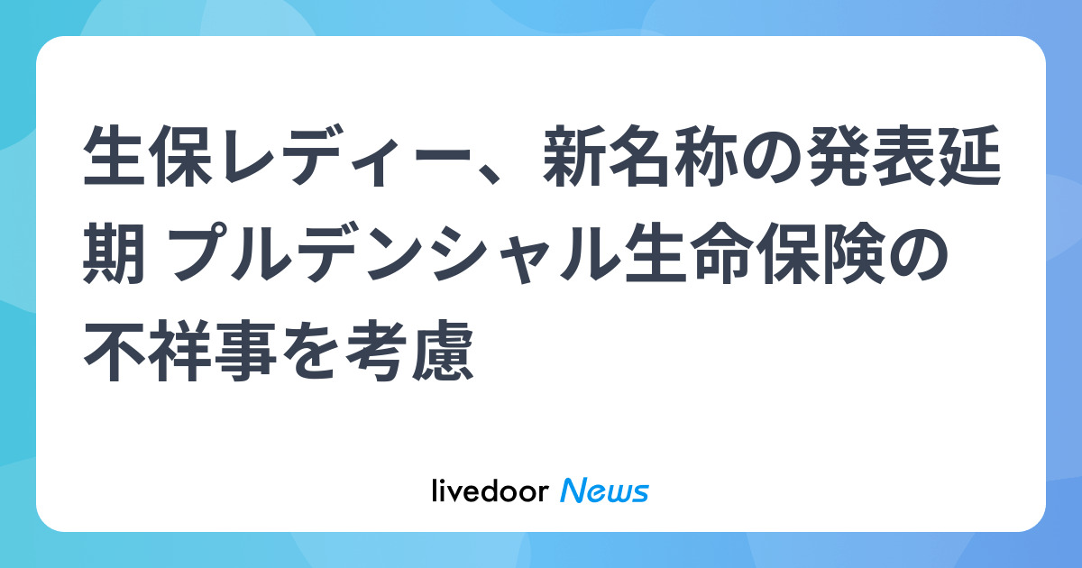 ニューストップ > IT 経済ニュース > 経済総合ニュース > 「生保レディー」新名称の発表延期 保険 生命保険 「生保レディー」新名称の発表延期 生保レディー、新名称の発表延期 2026年2月4日 16時12分 共同通信 リンクをコピーする みんなの感想は? 外部サイト パナHDが通期業績予想を下方修正 ◆エクセルが自己破産申請へ ◆【写真】ホンダ新車にかかった?呪い?「ウチのもこの顔」「それにしか見えないw」 納車初日に運転席に乗り込んでみると… ランキング 総合 国内 政治 海外 経済 IT スポーツ 芸能 女子 1. 乳児死亡 29歳母親に無罪判決 2. 巨乳を描いた10円玉 多数出回る 3. 大谷の人格に言葉失う…理由解説 4. 白衣着て医師を装いわいせつか 5. 五輪報奨金論争に水谷氏が私見 6. WBC 韓国戦で「ガラガラ」困惑 7. 性的暴行か NHKディレクター逮捕 8. 麻原氏の次男宅から驚きの証拠品 9. 稲垣「ヒロくん」と離別したか 10. 無愛想で知られる大谷…豹変か 11. 堀江氏 突如「クソみたい」激高 12. 劇団ひとり 娘の卒園式で失敗 13. GACKTに指摘「感覚ズレている」 14. 「相棒24」最終回SP 予告が話題 15. サナエトークン巡り重大疑惑浮上 16. 脳梗塞&失語症 M-1復帰の芸人 17. 初来日 日本のカレー食べて一言 18. メルカリに転売ヤーつぶし組出現 19. 「Mステ」に大森ら 豪華面々登場 20. 小川菜摘 次男の「職業」明かす 1. 乳児死亡 29歳母親に無罪判決 2. 巨乳を描いた10円玉 多数出回る 3. 白衣着て医師を装いわいせつか 4. 性的暴行か NHKディレクター逮捕 5. 麻原氏の次男宅から驚きの証拠品 6. サナエトークン巡り重大疑惑浮上 7. メルカリに転売ヤーつぶし組出現 8. 羽賀研二 服役後飲み歩けた理由 9. 天皇陛下がつい本音か 発言話題 10. 岡山発激安スーパー 全国展開へ 11. 「Japan is Back」中止に→困惑 12. 刺されたママが外に 腸出ていた 13. 竹内と熱愛報道女優大出世確定か 14. 小川晶氏 再選後に態度が豹変か 15. 「うつすよ」わいせつ行為に抵抗 16. 「ダイドー」自販機2万台撤去へ 17. 日本には8種類の韓国人がいる 18. りくりゅうへの失礼質問を猛批判 19. 映画監督・榊英雄被告へ懲役判決 20. 妊婦搬送→流産「因果関係ない」 1. ロト7 全国売り場初12億円が出た 2. ホルムズ海峡封鎖→海自が活躍か 3. 高市首相「イランの行動を非難」 4. サナエトークン変更も…再び非難 5. 身動き取れず遅刻 小野田氏陳謝 6. イランで日本人2人が拘束される 7. はいそれサギです 替え歌が話題 8. 旧二階派 政策研究会立ち上げ 9. 議員と政治家娘YouTuberが結婚 10. 泉健太氏 文科大臣に呆れて苦笑 11. 低年金高齢者 各地で過酷な事態 12. 二階元幹事長が「頑張れ」と激励 13. TV局が政治記者に頼る本当の理由 14. トイレとクローゼットに男女遺体 15. 紀子さま同行…悠仁さま複雑胸中 16. ラサール氏出馬でネット冷笑の嵐 17. 旭川17歳殺害 女の供述食い違う 18. 新幹線の文字ニュース終了へ 19. 外国人が不正? 外免切替に不満 20. 「SANAE TOKEN」巡る一文 物議 1. 初来日 日本のカレー食べて一言 2. イランのドローン空母無残に撃沈 3. 中国製防空システムへ深刻な疑問 4. 元王子の元妻 ホームレス状態に 5. 中国の自動車産業で泥沼消耗戦 6. イラン首都に新たな大規模攻撃 7. 米軍がイラン艦撃沈 残酷な現場 8. 原油枯渇したら日本はどうなる? 9. 米国に驚くべき諜報能力があった 10. 報復の矛先はトルコ NATOも反発 11. バハマ船籍の原油タンカー爆発か 12. イランの世界遺産 空爆の被害 13. アリサ・リュウ 意外なSNS使用法 14. 「ペガサス3」世界興収1位に 15. スシロー店舗を当局が検査、「マグロに寄生虫の卵」と客主張―中国 16. トランプ氏と欧州首脳らに亀裂 17. 米&イスラエルのイラン攻撃全貌 18. イラン外相、米国に報復を示唆 19. 東京に4つ「在日朝鮮人街」ある 20. 台湾 中国からの侵食に危機感か 1. セブン3日間だけ朝に値下げ 賛否 2. 貯金5000万円も…75歳男性の後悔 3. ジャングリア沖縄 成否正念場に 4. 露経済 裏で進む「静かな崩壊」 5. 65歳での年金受給は「やめとけ」 6. ニューバランスの靴 ほぼ半額も 7. カスハラでバス運休「英断」の声 8. なぜ今コメ価格が下がっている? 9. 転職10回「脳腫瘍のせいでした」 10. 医師救う ChatGPTのすごい使い方 11. 反日デモない 中国政権恐れてる? 12. 前市長 学歴偽り重すぎる代償か 13. ClarksがAmazonで最大65%OFFに 14. 最大65%OFFも Amazonの目玉商品 15. 黒字リストラ 想定外事態に後悔 16. サッポロHD 自販機事業撤退へ 17. 中国ファンド ブルーボトル買収 18. OliveがPayPay連携で…大激変 19. イラン ホルムズ海峡が再開された場合、生物兵器を発射すると警告 20. てんや 期間限定メニューを販売 1. 即買い Amazonセールの売れ筋20 2. 家をもっと便利に towerがセール 3. 月収20万減「AIに仕事奪われた」 4. Amazon限定販売 SALE商品まとめ 5. UNITED ARROWSがすべて40%OFFに 6. Apple「MacBook NEO」発売へ 7. Amazonでボトル飲料が最大半額に 8. Airpods最新モデルが楽天でSALE 9. カップ麺や袋麺が最大40%OFFに 10. プレステ5本体もAmazonでSALEに 11. ヘインズのTシャツが最大50%OFF 12. THE NORTH FACEが最大45%オフに 13. BBQ