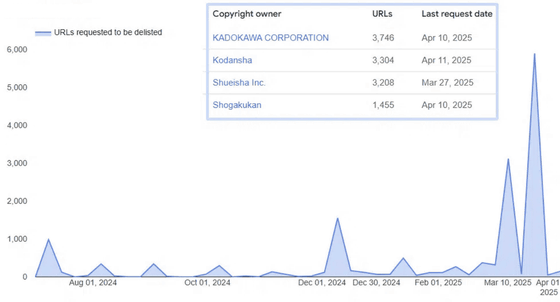 集英社が告発したマンガサイトは2024年5月に登場し、2025年3月頃から大きくアクセス数を伸ばし始めました。2025年3月から4月にかけてKADOKAWA・講談社・集英社・小学館の合計1万話以上のマンガ作品が違法に公開され、2025年5月の月間アクセス数は1億8500万回に達しました。