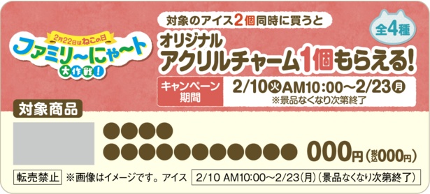 「ファミリ〜にゃ〜ト大作戦!」期間中、対象のアイスを2個買うごとに、ファミリーマート限定デザインの「mofusand」オリジナルアクリルチャームが1個もらえるキャンペーンも実施される。今しか手に入らない、かわいらしいアクリルチャームをぜひゲットしてほしい。キャンペーン期間は2月23日(祝)まで。