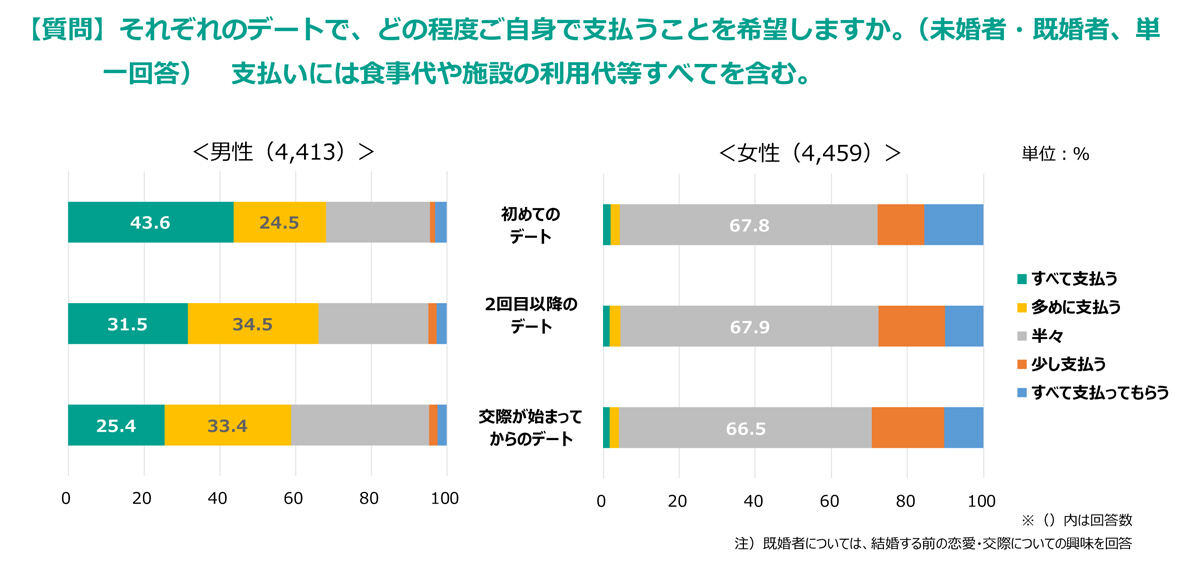 デートで、どの程度ご自身で支払うことを希望しますか(未婚者・既婚者、単一回答) 支払いには食事代や施設の利用代等すべてを含む。