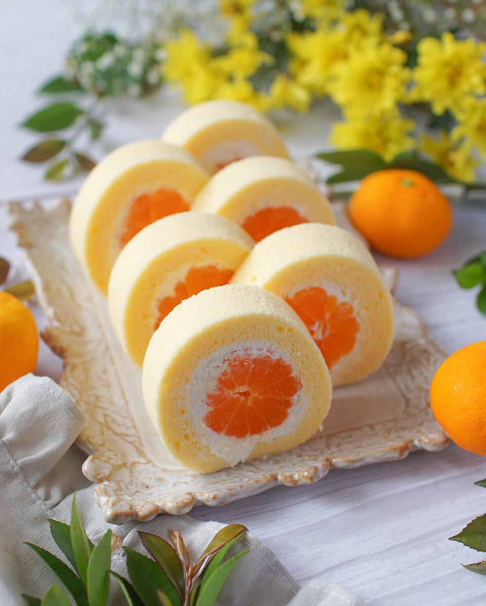 小粒みかんを1個丸々巻いた、断面萌えの「みかんロール」。@kinarieさんのレシピで作る米粉生地は、きめ細かく驚くほどふわふわ! 口溶けが良く、ジューシーなみかんと相性抜群です。