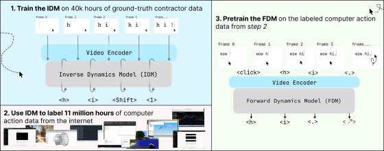 FDM-1はVLMベースのPC操作AIとは異なり、インターネット上に存在する「ビデオ編集の様子を記録した動画」や「コーディングのライブ配信」などからなる合計1100万時間分の動画を用いて学習しています。また、動画のアノテーションを自動化するために「IDM」というシステムも開発されました。
