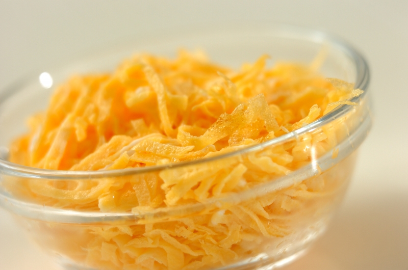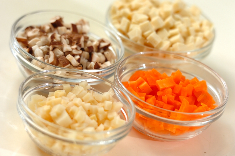 1、高野豆腐は水、またはぬるま湯で柔らかくもどし、軽く水気をきって5mm角に切る。ニンジンは皮をむいて5mm角に、シイタケは石づきを切り落とし、5mm角に切る。水煮タケノコも5mm角に切る。<卵液>の材料を混ぜ合わせる。
