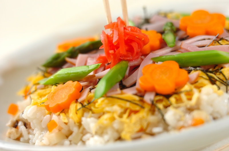 お刺身を使わず、ハムやアスパラガスで仕上げるちらし寿司です。前日に具材を煮ておけば、当日は酢飯に混ぜるだけで完成。手軽に時短が叶うのもうれしいポイントです。野菜の旨みがギュッと詰まったやさしい味わいは、大人にも愛される一品です。
