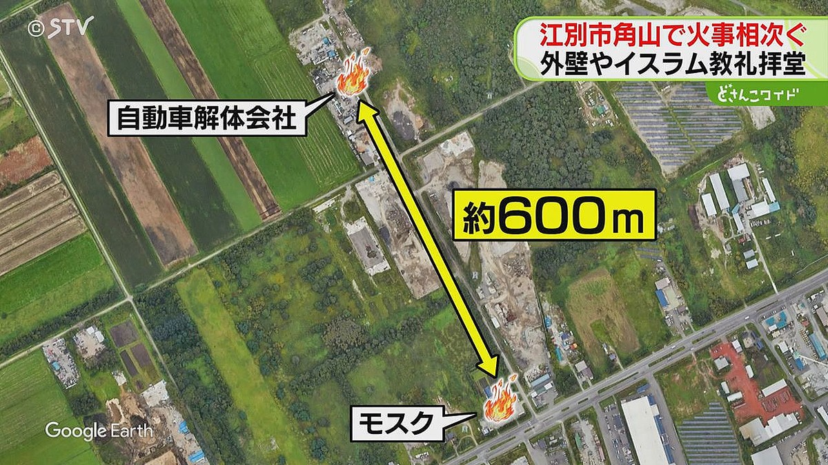 ニューストップ > 国内ニュース > 社会ニュース > 不審火の可能性も…パキスタン人経営店舗で火事 先月にはイスラム教… 不審火の可能性も…パキスタン人経営店舗で火事 先月にはイスラム教の礼拝所全焼も 江別市角山 不審火の可能性も…パキスタン人経営店舗で火事 先月にはイスラム教の礼拝所全焼も 江別市角山 2026年3月2日 16時53分 STVニュース北海道 同じ地区では2月28日にもイスラム教の礼拝所が燃える火事が起きています。(青柳記者)「江別市の角山のパキスタン人が経営する店舗です。警察などが実況見分をしています」捜査員でしょうか、建物の周辺を調べています。江別市角山のパキスタン人が経営する自動車解体会社で1日午後5時すぎ、目撃した人から「建物の外壁に焦げた痕がある」と警察に通報がありました。 警察によりますと、プレハブ小屋の外壁に幅1メートルほどの焦げた痕が見つかったということです。警察官が現場に駆けつけたときには火や煙はありませんでしたが、不審火の可能性も含めて捜査しています。 さらに、この会社からおよそ600メートル離れた場所では2月28日未明、建物が全焼する火事がありました。焼けたのは、イスラム教の礼拝所・モスクとして使われていた平屋建てのプレハブです。消防などによりますと、隣の建物にも延焼しましたが、火はおよそ1時間半後に消し止められ、けが人はいなかったということです。 リンクをコピーする みんなの感想は? 外部サイト 「建物の外壁に焦げた痕がある」 パキスタン人経営の自動車解体会社 2日前には付近のモスクで火事… 北海道江別市 イスラム教礼拝所で火事 平屋建ての建物2棟が燃える 北海道江別市 札幌市北区で住宅火災 住人は逃げて無事 関連情報(BiZ PAGE+) 在宅医療, 住宅, ホテル, 思いやり, ネジ, リハビリ, ダイス, 生花, 置床工事, 金属加工 ランキング 総合 国内 政治 海外 経済 IT スポーツ 芸能 女子 1. 新幹線で551はNG? 実業家「は?」 2. 劇団ひとり 娘の卒園式で失敗 3. ももクロ 佐々木彩夏が結婚発表 4. 妊婦搬送→流産「因果関係ない」 5. 妊婦搬送中に脱輪事故→流産 6. SHISHAMO ファイナルツアー中止 7. 遺産5000万円に有頂天 残酷末路 8. 美穂さん急逝直前まで支えた恋人 9. 乳児死亡 29歳母親に無罪判決 10. 旭川17歳殺害 女の供述食い違う 11. 岡山発激安スーパー 全国展開へ 12. 宮舘涼太 事実上の「破局」か 13. 幸運招く? きょうは最強開運日 14. 上田晋也 芸人だと審査通らない 15. 泉ピン子宅で窃盗か 女を聴取 16. 「14歳下と不倫」にCocomi嫌悪感 17. カスハラでバス運休「英断」の声 18. 山本舞香 Hiroとの2SHOT公開 19. Apple「MacBook NEO」発売へ 20. 板野友美と前田敦子 不仲説再燃? 1. 妊婦搬送→流産「因果関係ない」 2. 妊婦搬送中に脱輪事故→流産 3. 乳児死亡 29歳母親に無罪判決 4. 岡山発激安スーパー 全国展開へ 5. 泉ピン子宅で窃盗か 女を聴取 6. カイロス3号機打ち上げ 飛行中断 7. 竹内と熱愛報道女優大出世確定か 8. 「佳子さまが着るの!?」話題 9. イクラちゃん役 桂玲子さん死去 10. 面識ない女性に性交か 男を逮捕 11. ニデック創業者の罵倒メール驚愕 12. 体液付けた疑い 巡査部長を逮捕 13. 中田氏 大谷シバこうとした過去 14. 美人局? 150万円でどがんですか 15. 首相 無関係言い切るの苦しいか 16. 小川晶氏 再選後に態度が豹変か 17. 「国宝級の卒業合唱曲」3選 18. 東京に4つ「在日朝鮮人街」ある 19. 新大久保で「宗教勧誘」に恐怖 20. NHK党が「休眠」発表 再開めどは 1. 遺産5000万円に有頂天 残酷末路 2. ネイリスト女性殺害 車に発信機 3. SANAE TOKENめぐり「お詫び」 4. 新幹線の文字ニュース終了へ 5. 浮気予備軍 生々しい本音を調査 6. 元参院議員の大塚耕平さん死去 7. 市場衝撃 資生堂の決算がヤバい 8. 東京アプリ 450億円を投じた背景 9. 低年金高齢者 各地で過酷な事態 10. 外国人が不正? 外免切替に不満 11. 夕張市 26年度に借金322億円完済 12. 73歳祖母の「シール帳」に大反響 13. 「先に行って」→発進 なぜ違反? 14. SANAE TOKEN「詐欺行為」批判 15. 父の死後「封筒」が招いた悪夢 16. 神奈川県警 なぜ不祥事で目立つ 17. ひろゆき氏 米イラン攻撃に私見 18. 陛下 妻子のリンクコーデに言及 19. 美容師「しんどい」と思う瞬間 20. 「どこまでも汚い」大石氏が批判 1. 日本旅行動画で批判あり…傷心に 2. 「変態プレイ」女性遺体切断 米 3. イラン政府 米国の攻撃前に崩壊? 4. トルコ領空に弾道ミサイル イラン発射、NATOが撃墜 5. 中国の自動車産業で泥沼消耗戦 6. イラン軍艦の撃沈映像異例の公開 7. 「世界一若く見える」男性に驚き 8. 韓国女優のマナー違反に批判殺到 9. 中国へのスパイ活動か 男3人逮捕 10. 北朝鮮を誰も止められなかった 11. トランプ氏の予測不能外交に指摘 12. 米軍でUFO研究に関与 行方不明に 13. NATOが亀裂? 韓国にも影響か 14. 旧統一教会解散命令に不満あらわ 15. AIに仕事奪われる 米人が恐怖か 16. ハメネイ師次男が後継の有力候補 17. 米軍が沖でイラン軍艦攻撃と報道 18. 「夜に何度も爆音」中東情勢緊迫 19. 生後4カ月乳児に…韓で怒り