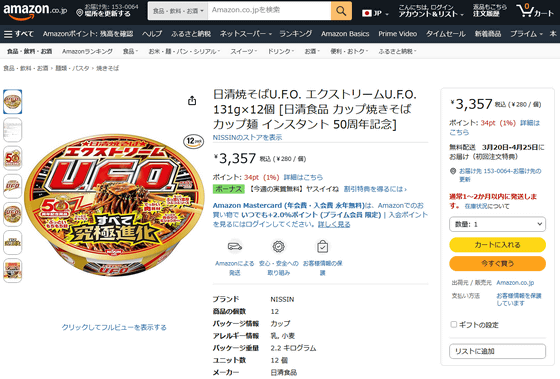 日清焼そばエクストリームU.F.O.は2026年3月2日から全国で入手可能です。希望小売価格は税別259円で、Amazon.co.jpでは12食セットを税込3357円(1食当たり280円)で入手できます。
