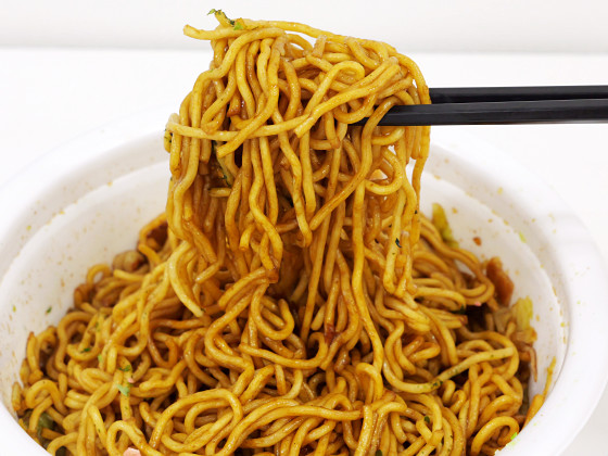 エクストリームU.F.O.は、まず麺が太くなっていて、モチモチ感が各段に向上しています。ソースはフルーティーな風味やスパイシーさが増強されていて、甘辛さが増しています。いつものU.F.O.はソースのスパイシーな味とともにだしのような優しい香りも感じられるのですが、エクストリームU.F.O.はソースの甘さとスパイシーさが強烈に主張してきます。いつものU.F.O.は単体で楽しめる味ですが、エクストリームU.F.O.はかなり濃い味付けなのでパンとか米が欲しくなります。編集部員の中には「エクストリームU.F.O.はお酒のツマミになるくらい濃い味」と感想を述べる者もいました。エクストリームU.F.O.は「いつものU.F.O.のアップグレード版」というわけではなく、味の濃さを追求した別ベクトルの食べ物に仕上がっている印象。味がハッキリ異なるので、食べ比べるのが楽しいカップ焼きそばでした。
