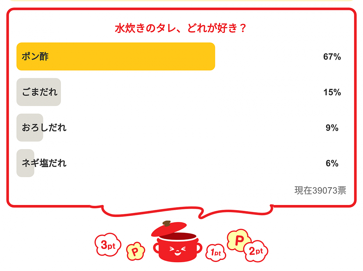 ニューストップ > グルメニュース > 「水炊きのタレ、どれが好き?」<回答数39,073票>【教えて! みん… 「水炊きのタレ、どれが好き?」<回答数39,073票>【教えて! みんなの衣食住「みんなの暮らし調査隊」結果発表 第457回】 「水炊きのタレ、どれが好き?」<回答数39,073票>【教えて! みんなの衣食住「みんなの暮らし調査隊」結果発表 第457回】 2026年3月3日 6時0分 E・レシピ E・レシピ編集部のTです。新企画「みんなの暮らし調査隊」、毎日たくさんの方にご参加いただきありがとうございました!■今回の結果は?今日の質問は「水炊きのタレ、どれが好き?」さてみなさんの回答は…?■今回の質問:「水炊きのタレ、どれが好き?」 ・「水炊きのタレ、どれが好き?」の結果は…・1位 … ポン酢 67%・2位 ごまだれ 15%・3位 おろしだれ 9%・4位 ネギ塩だれ 6% ※小数点以下四捨五入39,073票 ・結果はいかがでしたか?今日の結果はどうでしたか?意外?それとも思った通り?明日の結果もどうぞお楽しみに!おすすめレシピもチェックしてくださいね。■今日のおすすめレシピかんたん水炊き+ピリ辛ゴマダレ【材料】(作りやすい量)白ゴマ 大さじ 4ゴマ油 大さじ 2砂糖 大さじ 2しょうゆ 大さじ 2酢 大さじ 1豆乳(成分無調整) 100mlラー油 少々【作り方】1、白ゴマをすり鉢でする。白ゴマが細かくなってきたらゴマ油を入れ、よくなじむようにすり混ぜる。2、砂糖、しょうゆ、酢、豆乳の順に分離しないように少しずつ混ぜていく。最後にラー油を加える。【このレシピのポイント・コツ】子供や辛いものが苦手な方にはラー油抜きでマイルドな味を楽しめます。(E・レシピ編集部) リンクをコピーする みんなの感想は? 外部サイト そのまま食卓へ!耐熱容器で作る絶品レシピ6選〜並べて焼くだけ!おもてなしにも映える時短術 春の香りを満喫!ふきのとうの人気レシピ3選♪簡単でおいしい旬の味 「今年のバレンタイン、誰に贈る?」<回答数39,784票>【教えて! みんなの衣食住「みんなの暮らし調査隊」結果発表 第453回】 関連情報(BiZ PAGE+) お菓子, どら焼き, スイーツ, タコス, バームクーヘン, フルーツ大福, ラーメン, 和菓子, 麺 ランキング 総合 国内 政治 海外 経済 IT スポーツ 芸能 女子 1. 取り締まり寸前に ジュニア告白 2. 父娘最後の会話は「死んじゃえ」 3. 「カモ」にされた大学生 逃亡5年 4. 女性にテキーラ32杯飲ませ死亡 5. 妊娠中の性欲「我慢の必要ない」 6. 姫路城の料金「上げすぎ」の声も 7. 睾丸保護用グッズ 使用禁止通告 8. セブン 朝限定でおにぎり100円に 9. スマホ向け恋愛ゲーム「恋と深空」が異例の発表 担当声優が契約満了で降板 ファン騒然「衝撃すぎる」 10. 態度の悪さ 背景には「幼児性」 11. パワハラでうつ 変化の「一言」 12. Hiro&山本舞香の計画ストップか 13. 車の「358」ナンバー なぜ人気? 14. マンガワン フリーレンも終了に 15. イモト「家庭崩壊」と占われる 16. 小川市長、再選6日後にホテルへ 17. 平愛梨 連日「号泣」に心配の声 18. 首相「SANAE TOKEN」に注意喚起 19. 米軍機3機が墜落 誤って撃墜か 20. 客の下半身が丸見え 盗撮多発 1. 父娘最後の会話は「死んじゃえ」 2. 「カモ」にされた大学生 逃亡5年 3. 女性にテキーラ32杯飲ませ死亡 4. 妊娠中の性欲「我慢の必要ない」 5. 姫路城の料金「上げすぎ」の声も 6. 睾丸保護用グッズ 使用禁止通告 7. セブン 朝限定でおにぎり100円に 8. 態度の悪さ 背景には「幼児性」 9. マンガワン フリーレンも終了に 10. 小川市長、再選6日後にホテルへ 11. 客の下半身が丸見え 盗撮多発 12. 夫が浮気 妻が問い詰め「豹変」 13. イラン ホルムズ海峡封鎖し警告 14. 別府ひき逃げ 情報提供1万2479件 15. 「大したことない」75歳女を逮捕 16. Googleの警告に「過剰」指摘続出 17. 「SANAE」で誤認しないで 高市首相“仮想通貨”について「全く知らない。何らかの承認を与えたこともない」 18. 韓医師「日本はストレス少ない」 19. 参院選で大量水増し 4人書類送検 20. 雪上車で女児死亡 禁止区域か 1. 首相「SANAE TOKEN」に注意喚起 2. 低年金高齢者 各地で過酷な事態 3. 韓国 漢字を100%捨てた理由とは? 4. 子ザルのパンチくん、友達と遊ぶ 5. 金価格が急騰 1グラム2万9865円 6. 石油備蓄は254日分あると首相 7. 「一口要求」シェア習慣に戸惑い 8. 資さんうどん 異例の説明に賛否 9. 先輩に言われて…謝罪文に葛藤 10. 神奈川県警 なぜ不祥事で目立つ 11. 安保3文書改定の有識者会議4月設置へ 12. 「1億円超の土地」所持も貧困 13. 精神疾患の障害年金 不支給理由 14. 「退職金の取り消し」認められず 15. 髪がフサフサに?驚きの洗髪方法 16. 『それは主観だ』に反発 竹田恒泰氏が神谷宗幣氏との討論を総括 17. 小島よしおが語る「至福の時間」 18. ジャスコに抗う切り札がガラガラ 19. 職務質問 2年前の下着盗撮バレる 20. マック出禁 学校名指し不可避か 1. 米軍機3機が墜落 誤って撃墜か 2. 外国人でもロシアに長期滞在するなら兵役義務、中国領事館が注意喚起 3. フランスが保有核弾頭数を増加 4. ハメネイ師を殺害に導いた新兵器 5. プーチン氏準備か